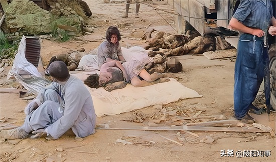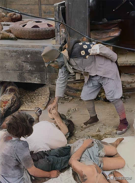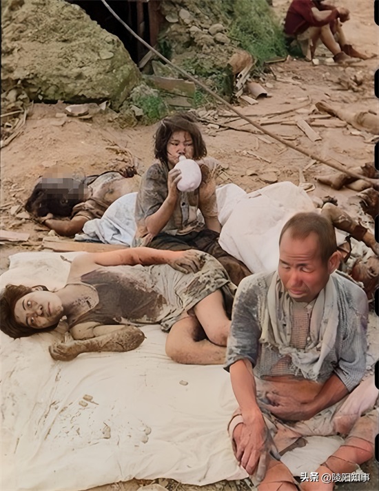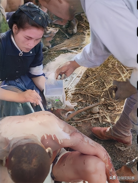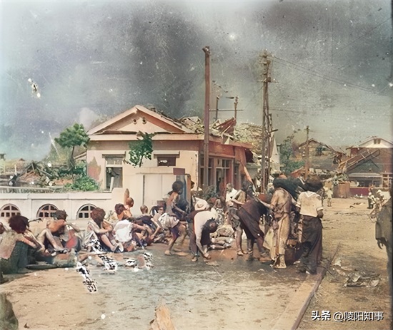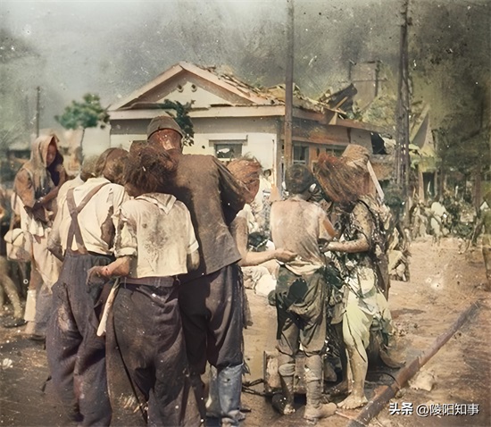 图中,广岛京桥川美幸桥西端,离核爆中心仅2.2公里。核爆后,千田警察分局的工作人员冒着生命危险,用油对伤者进行救治。这些伤者衣衫褴褛,蓬头垢面,生命面临巨大威胁。