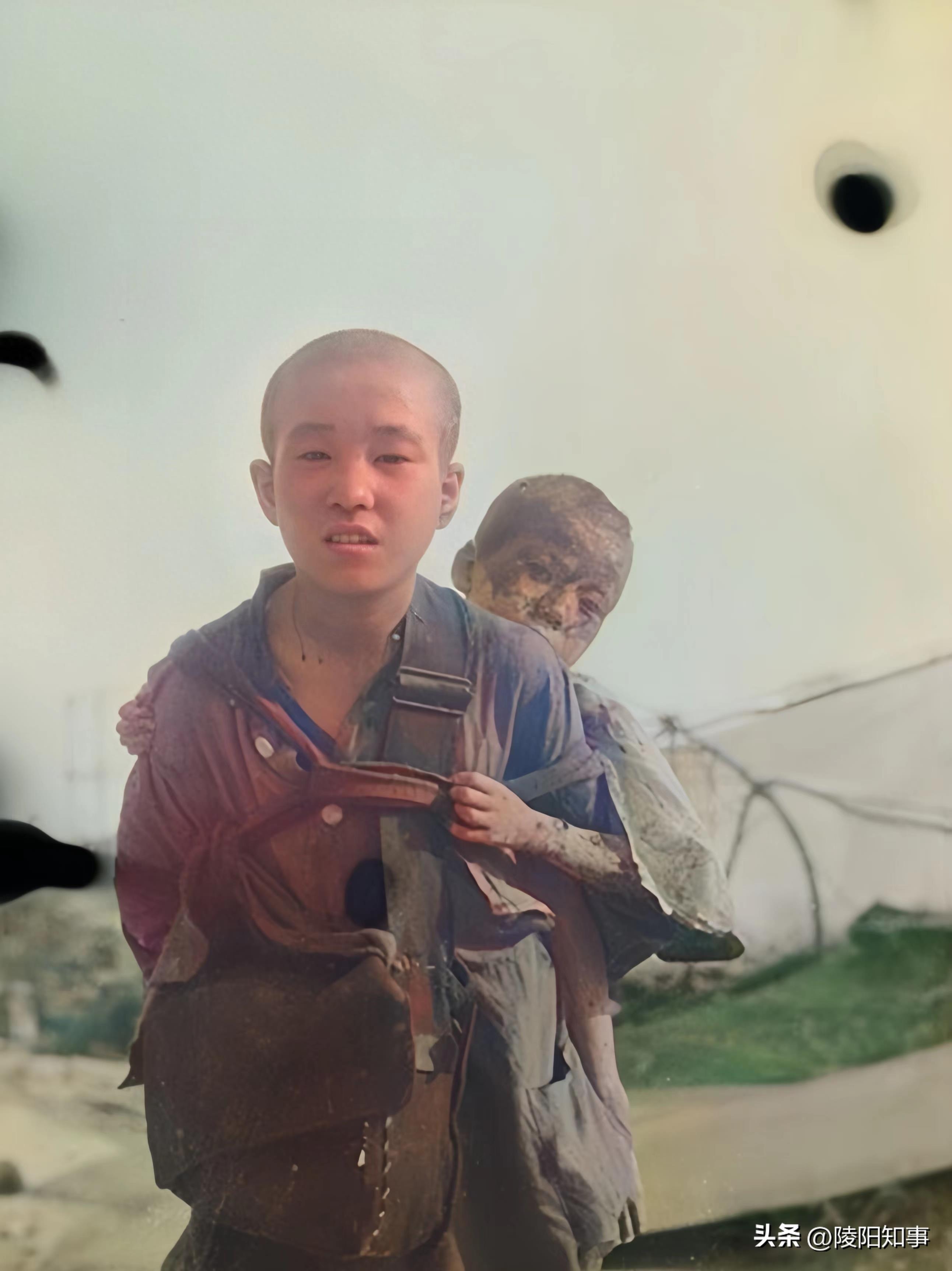 长崎县长崎站附近,一个男孩背着弟弟,家人在爆炸后失散,但他依然微笑面对镜头。