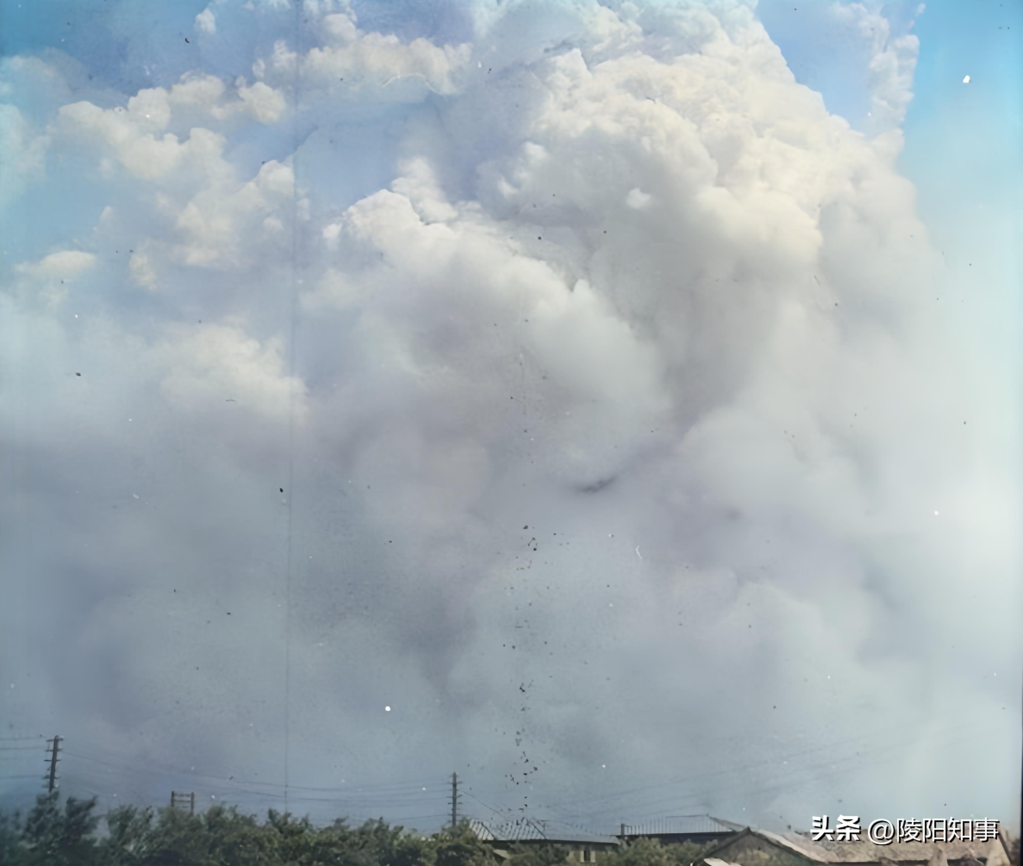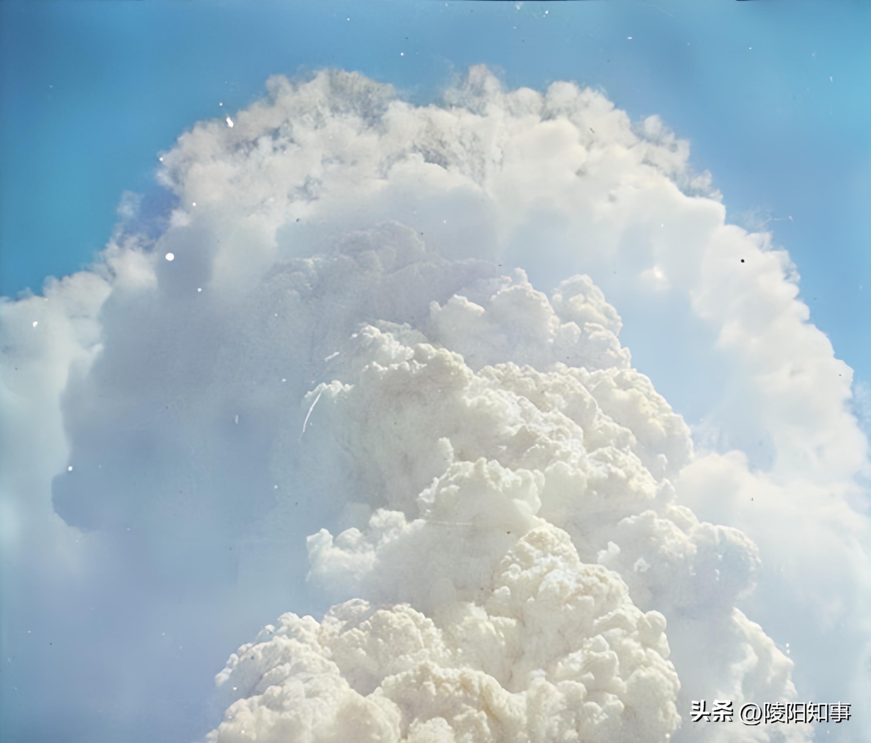 另一个角度的“蘑菇云”照片,几乎与普通白云难以区分,展现了核爆当天的晴朗天气。