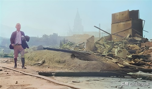 长崎县中町附近,核弹“胖子”摧毁的现场,满目疮痍,一名穿军服的男子无所适从。