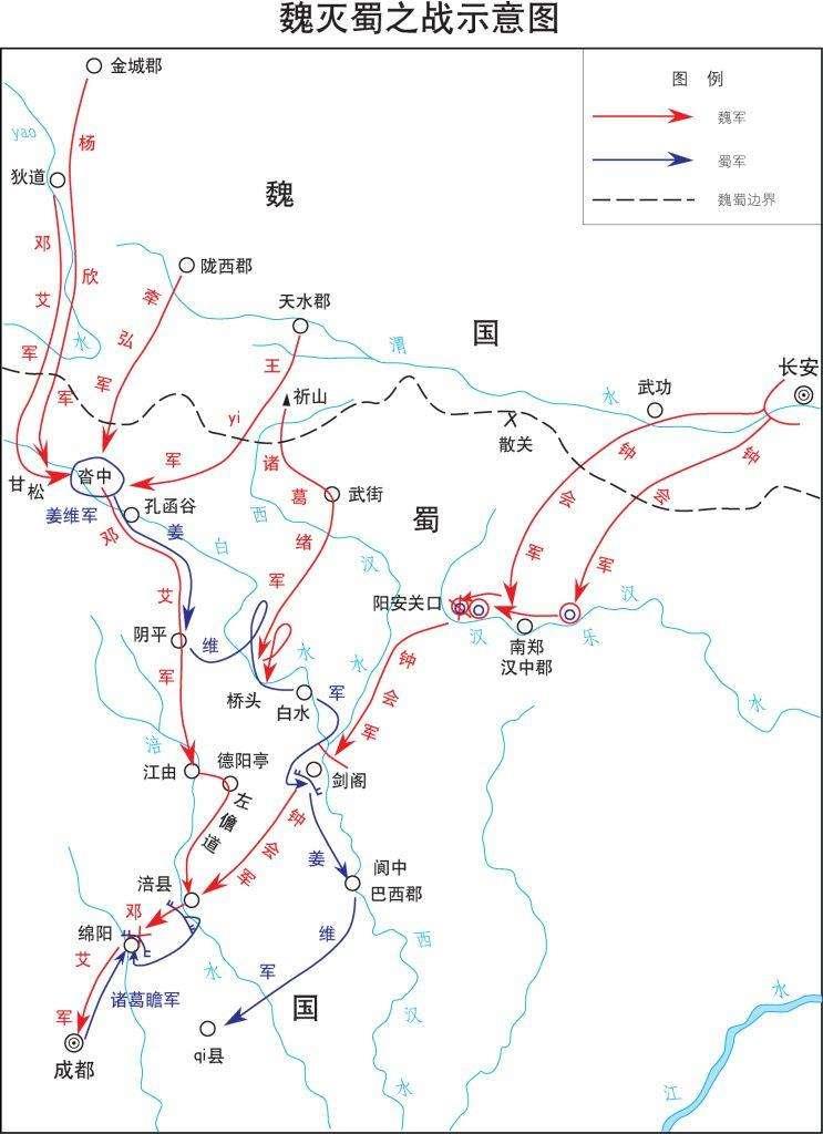 公元263年8月,十八万魏军分三路南下:西路军由邓艾所率的三万多人,出狄道向甘松、沓中直接进攻姜维;中路军由诸葛绪率三万多人马,自祁山向武街、阴平之桥头切断姜维后路;而东路军由钟会率主力十余万人,再分两路分别从斜谷、骆谷进军汉中。