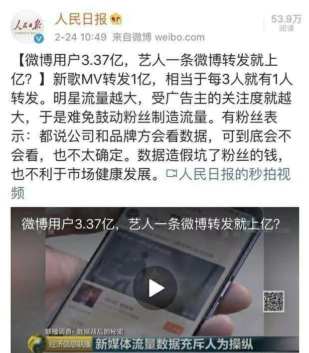 但与此同时,人民日报和紫光阁又发表了有关此事的文章,还特别提到“微博用户3.37亿,某艺人新歌mv转发量就达到了一个亿”。更称这种造假,会让演艺市场陷入不注重品质而流量至上的恶性循环。
