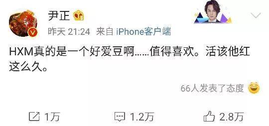 昨晚,尹正在微博发文,称“HXM真的是一个好爱豆啊,值得喜欢,活该能红这么久”。