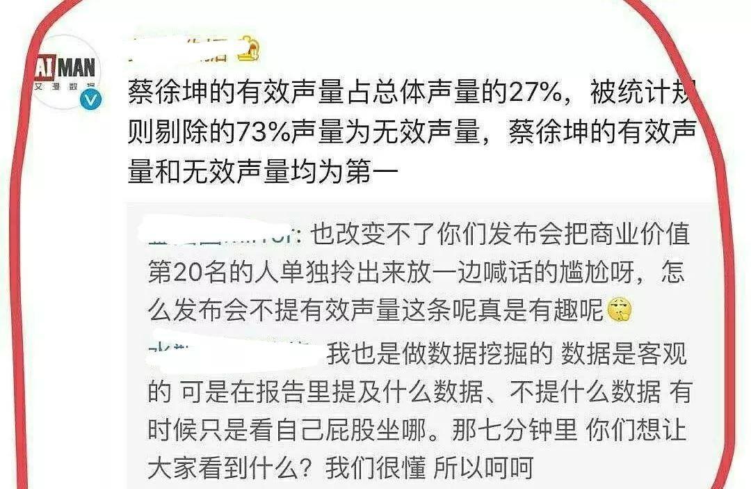 昨日,粉丝称现在的流量都注水,但蔡徐坤的数据就算脱水也是非常高的。之前某数据榜单称蔡徐坤虽然无效数据占比大,但他脱水后的数据也甩出第二很远。不过,不少瓜众都认为该榜单并没有很权威,粉丝最好还是别吹了。