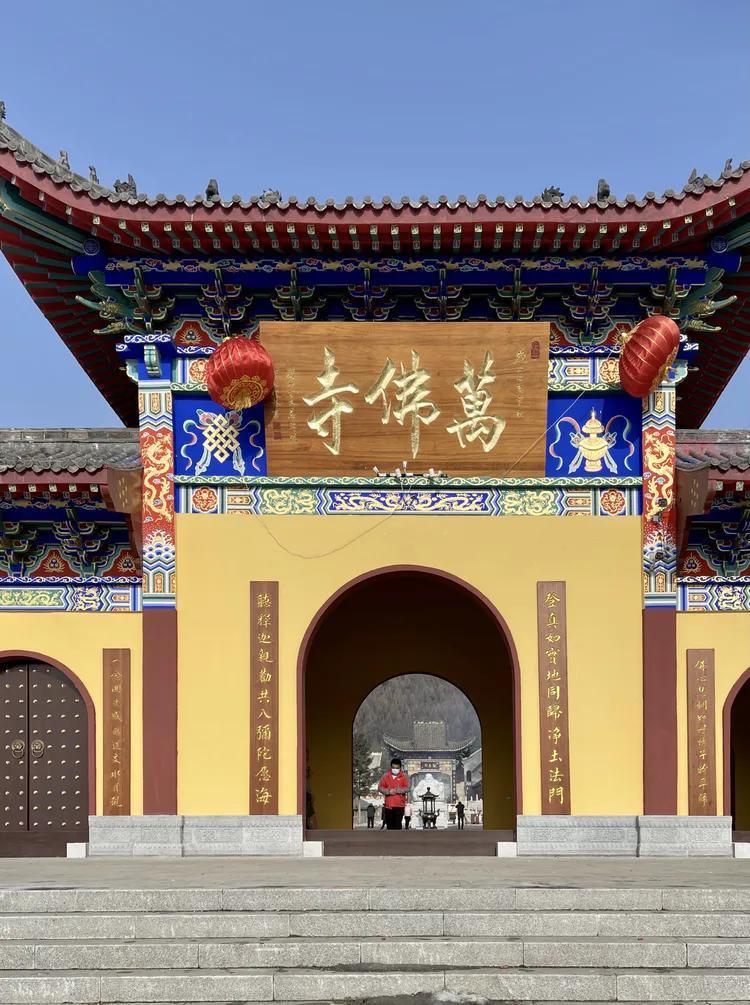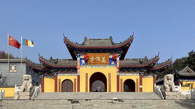 万佛寺建筑从山门开始依次递进,有山门殿、观音阁、天王殿、大雄宝殿、朝阳洞等,偏殿有药师佛殿、弥陀佛殿,其间建有钟鼓二楼、海音如来殿、财神殿、伽蓝殿、五观堂、客堂、法堂、地藏殿、净心亭、朝阳亭、书画院,山顶有大型观世音菩萨圣像。没有看到万佛塔,资料上有显示。