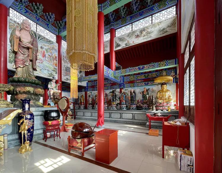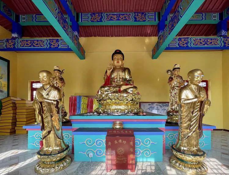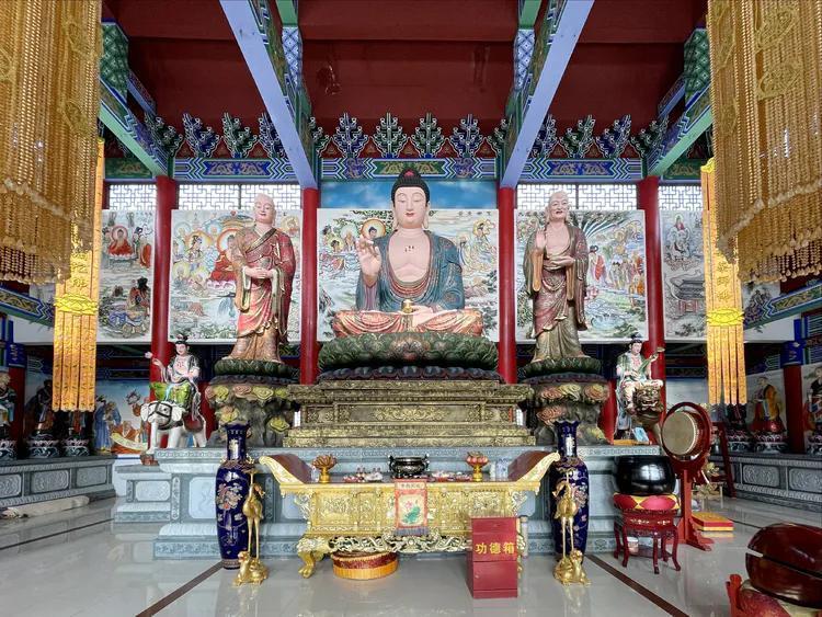 大雄宝殿供奉三世佛,与其他不同的是,药师佛、阿弥陀佛在大殿东西单十八罗汉方位上。