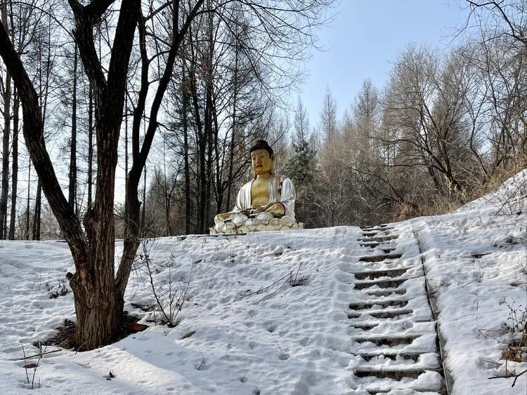 踏着厚厚的积雪绕礼地藏王菩萨。
