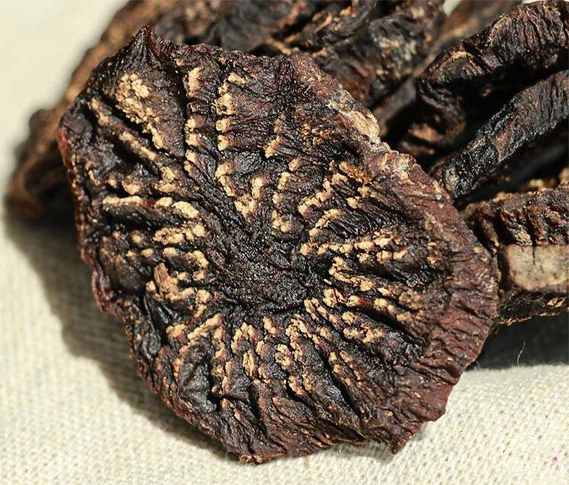 阿拉善苁蓉外型奇特,身披鳞片状“盔甲”,身子象圆圆的柱子,鲜苁蓉相对光洁白色或者黄白色,干苁蓉是棕色或者深棕色;干苁蓉横切面为褐色,浅褐色点状维管束呈波浪状环状排列。