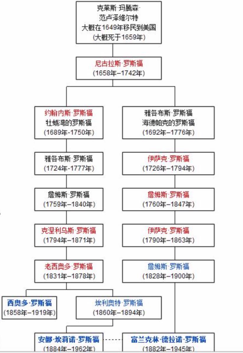 尼古拉斯有两个儿子,一个叫约翰内斯,是罗斯福家族在奥伊斯特湾一支的始祖,另一个叫雅各布斯,是罗斯福家族在海德帕克一支的始祖。