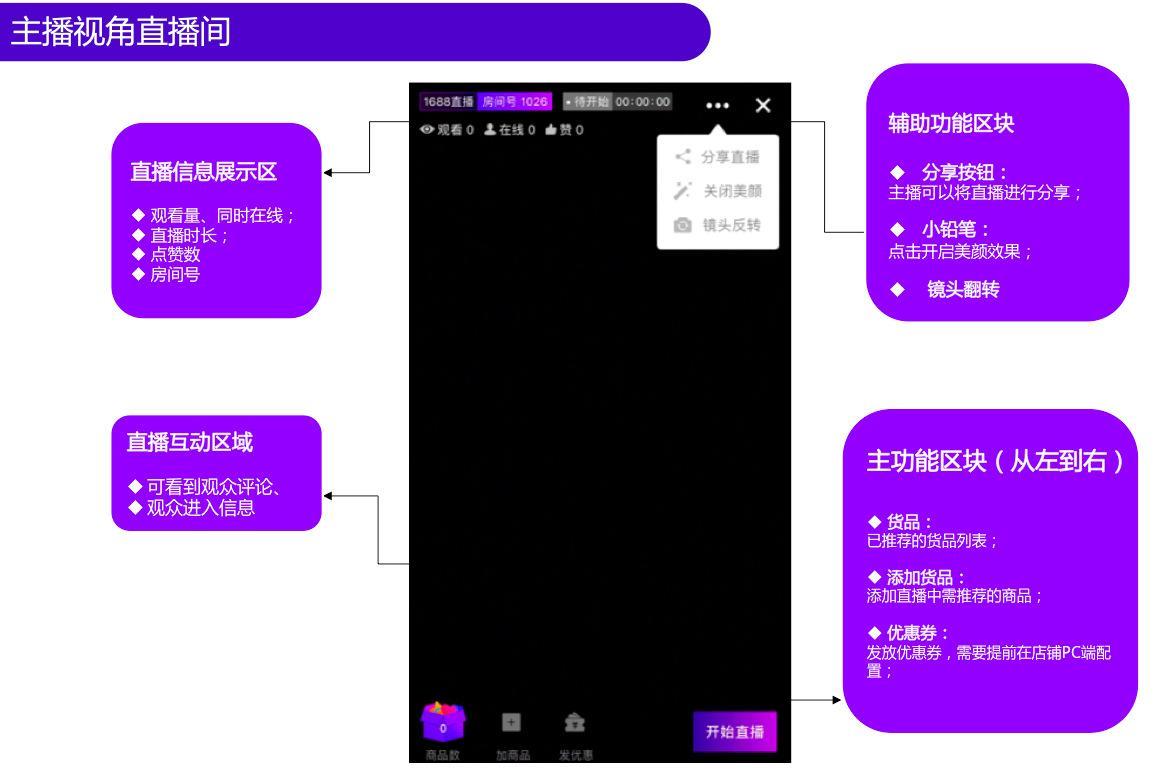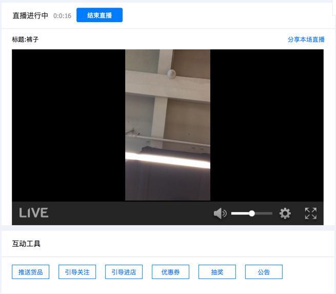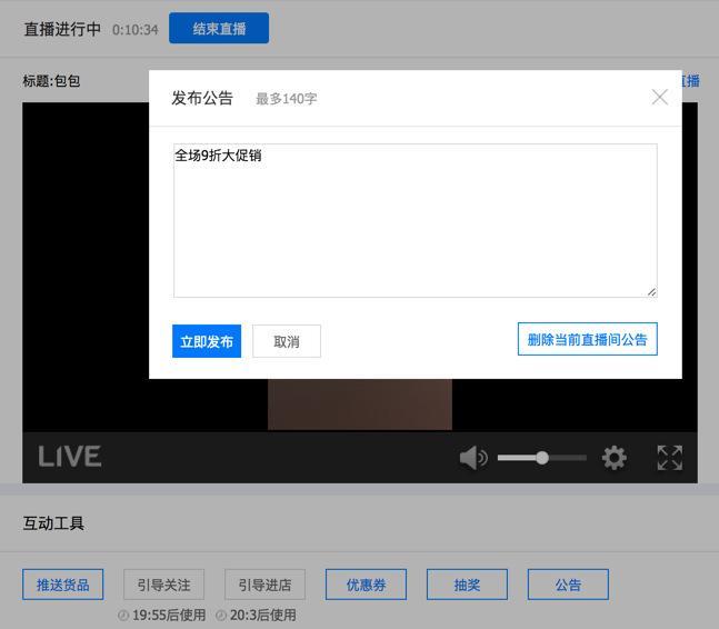 主播(商家)在手机端创建一个直播,在pc端登录店铺主账号,可以看到当前自己创建的正在直播中的直播,并且又很多功能性按钮。本期新增有:引导关注,引导进店,抽奖,公告。(引导关注和引导进店,有30min冷却时间。注意:观众端的阿里巴巴APP需升级最新版本才能看到!)