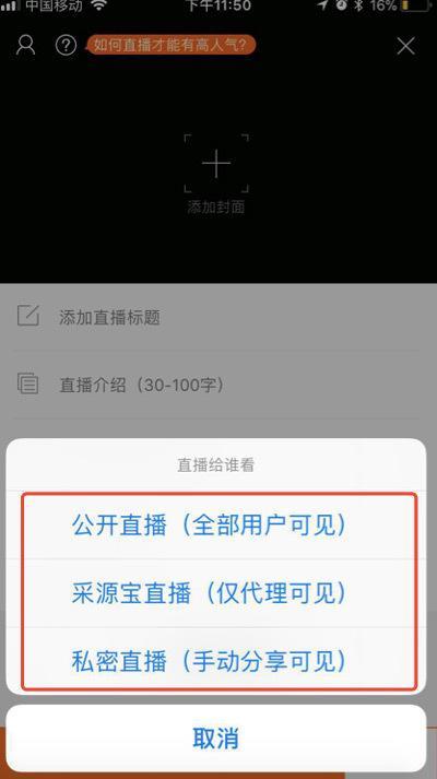 仅采源宝代理商可见:选择该功能,直播视频仅展示到采源宝,仅采源宝代理可见;(选择采源宝直播,下载采源宝APP且关注你的代理会收到一条消息推送,一天上限一条)