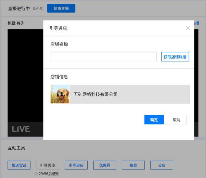 此时,观众端弹出如下框,观众点击“进店”按钮,进店铺浏览。