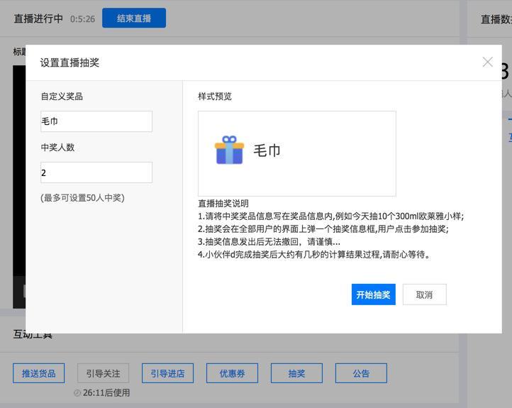 填写好,奖品名称及中奖人数,点击“确定”即可。 观众这边5个数倒数抽奖,或者中奖,或者没中奖。