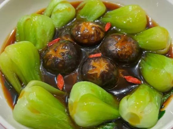 1、准备食材:小油菜、香菇、枸杞、蒜瓣、生抽、陈醋、蚝油、白砂糖、食盐