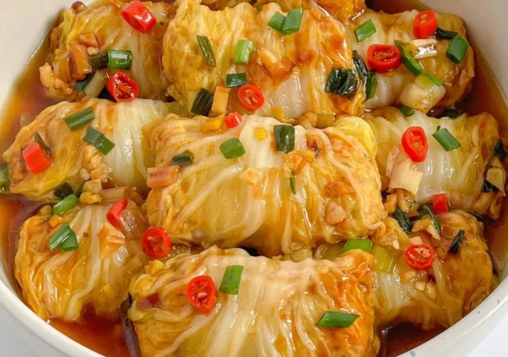 (8)大火收汁,关火,将料汁均匀地淋在蒸好的白菜卷肉,激发出香味,再撒上适量的葱花、小米辣点缀一下,就可以开吃了。