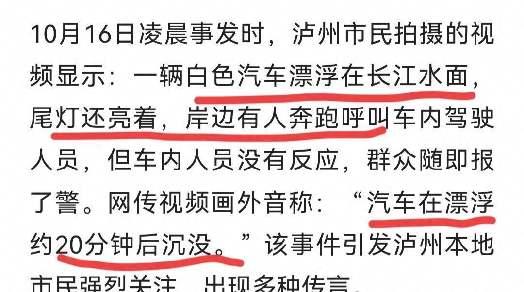 在四川泸州发生的宝马车坠江事故引起了广泛关注与热议。据目击者称,一名女司机在凌晨时分驾驶着她的宝马车突然冲入长江,随后车子漂浮在江面。虽然岸上有人呼叫,但车内的女司机没有作出任何回应,情况十分危险。