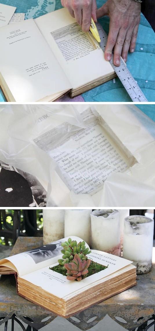 这个看起来对书有点残忍,或者说不够尊重,大家了解一下就好. 并且,纸张不能受潮,所以不太适合种植物,可以考虑种假的植物。