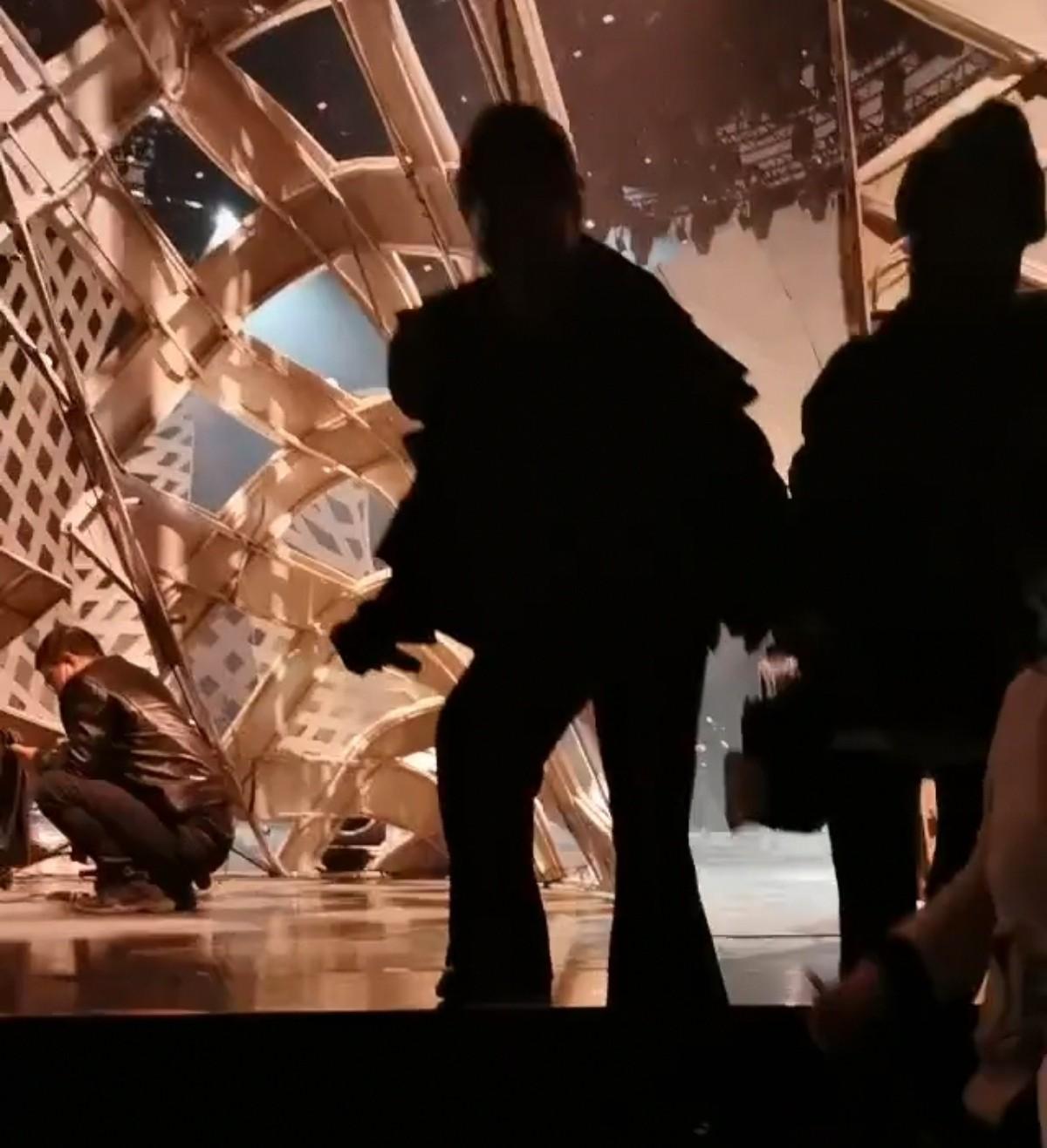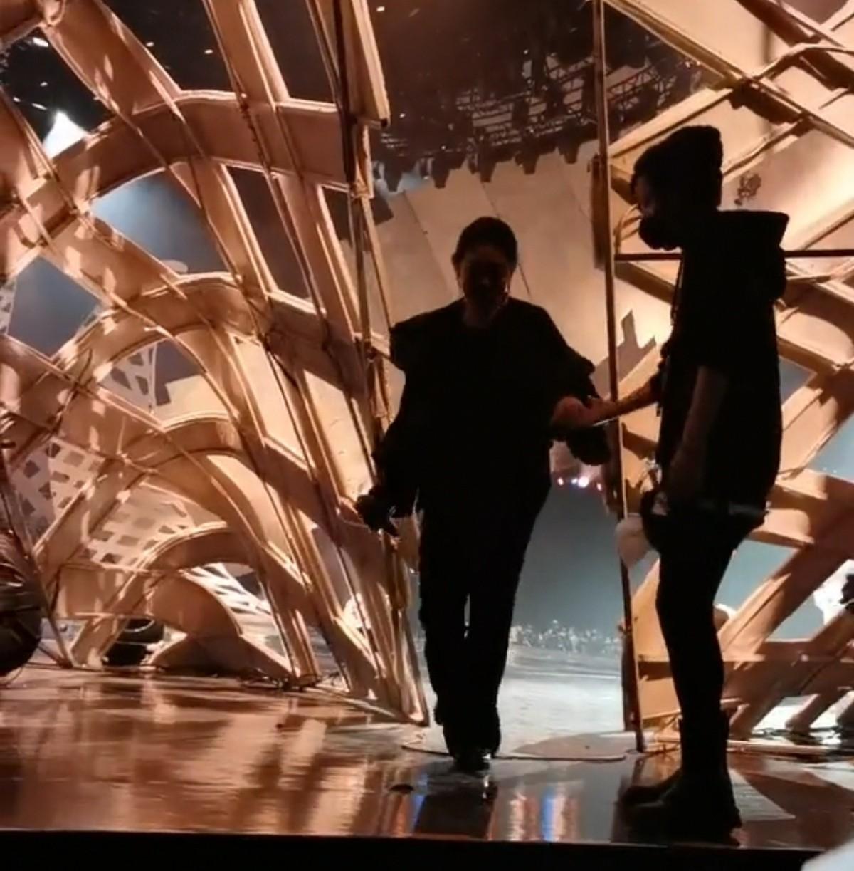 视频中记录着她走下舞台的过程,我们可以看到她的脸上带着淡淡的微笑,但是她走路的时候却是全程弯着腰,步履蹒跚的,每一步走的都很小心。而且在下楼梯的时候,等有人搀扶后,她才继续走了下去。