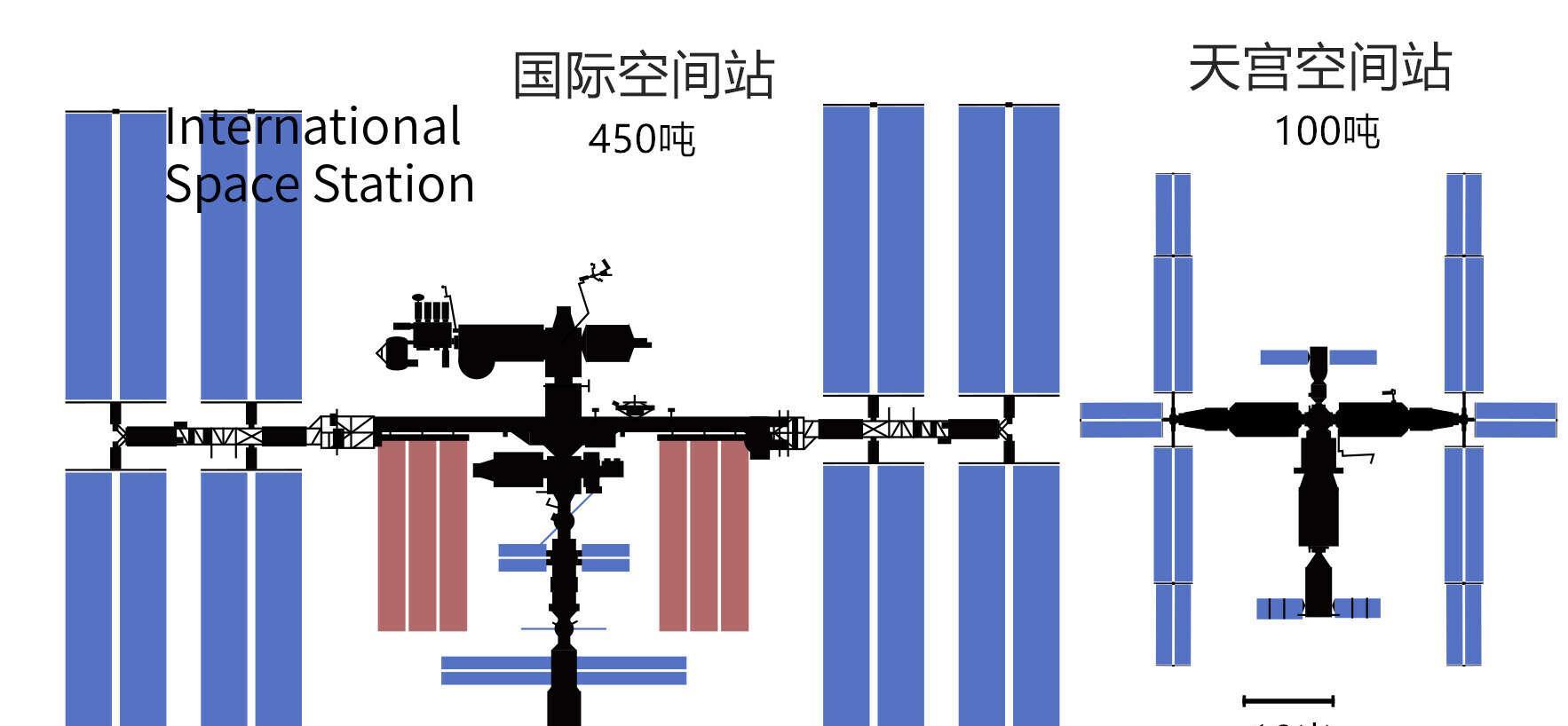 外形示意图如出一辙,国际空间站庞大而宏伟,天宫空间站相对娇小。国际空间站的总质量已经达到了惊人的450吨,而天宫空间站及其附属飞船的总质量仅略超过100吨,明显轻盈了许多。