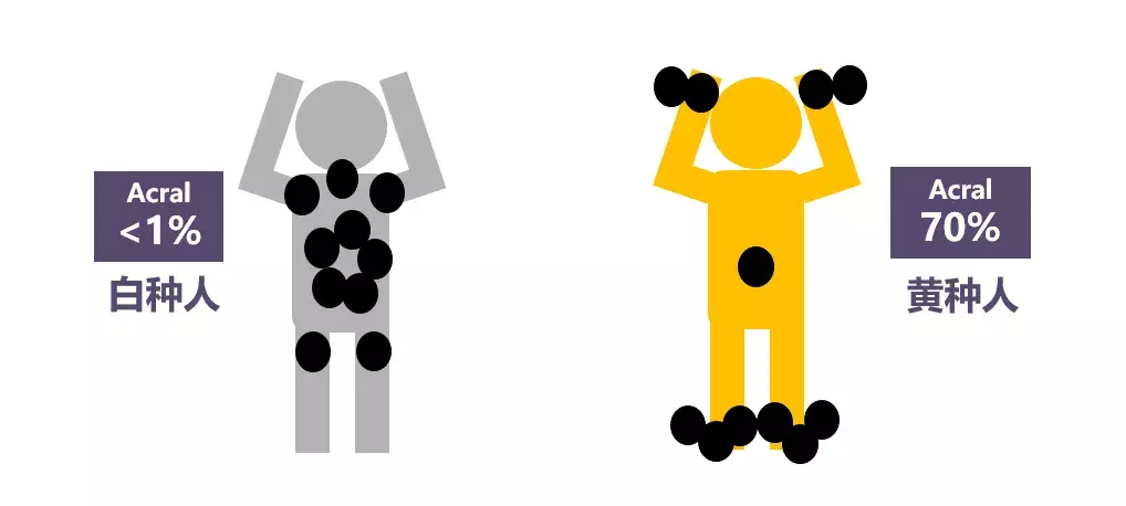 一般黄色种人的黑色素瘤50%在手脚,所以足底、手上的痣,需要注意是否有恶变的可能!