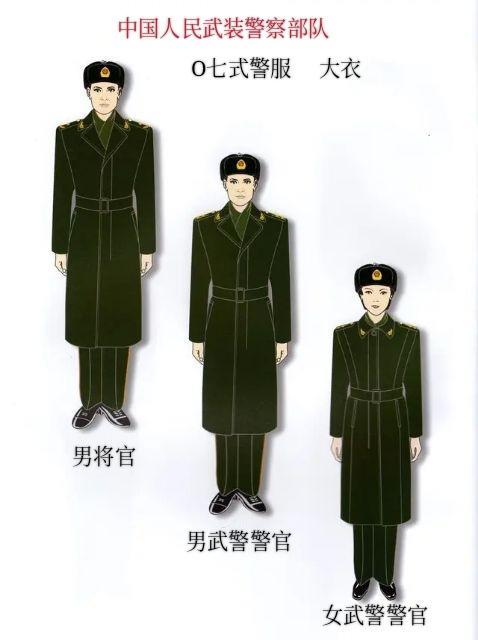 ④大衣:着武警大衣时,警官、文职干部佩戴松枝叶领花、常服硬肩章,穿大衣可戴围巾。士兵、士官学员穿棉大衣。