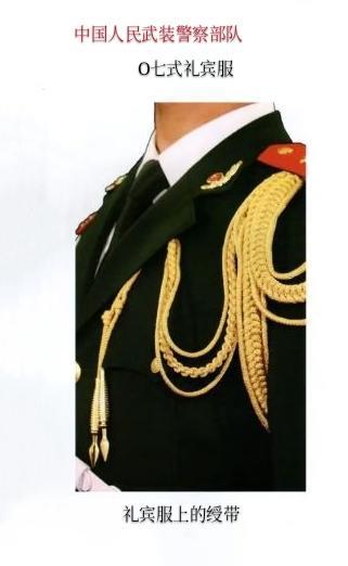 着武警警官礼服时,佩戴松枝领花、礼服肩章、胸标、级别资历章、姓名牌和绶带,内着礼服衬衣,系领带,穿制式袜子和礼服皮鞋,戴礼服大檐帽(女武警警官戴卷檐帽)。