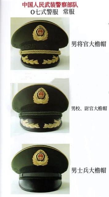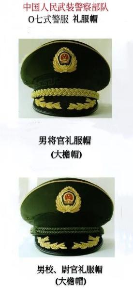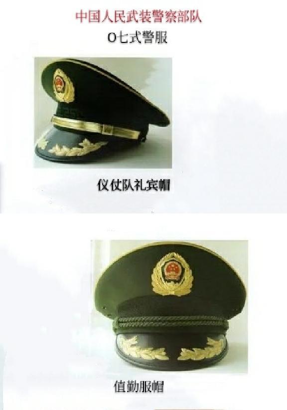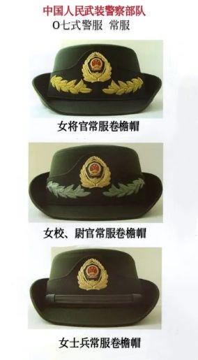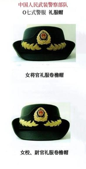 2.武警常服帽①男将官常服大檐帽和礼服大檐帽区别,帽饰带为双股绳编而成。②男校、尉官常服大檐帽和礼服大檐帽区别,帽檐花为高分子复合材料热压制作。③男士兵大檐帽,无帽檐花。④女将官常服卷檐帽,布料与礼服卷檐帽不同,其余都相同。⑤女校、尉常服卷檐帽面料釆用斜绞仿毛哔叽,内衬、里料与礼服卷檐帽相同。⑥女士兵常服卷檐帽