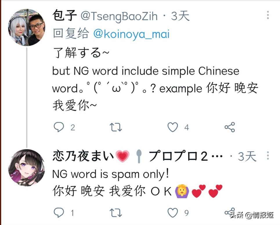 然而,作为日本人的恋乃夜舞并没有意识到这一点对于那些观众来说意味着什么,在推特下回复Ban掉的词语只能是SpamWord(一般指敏感词和垃圾词)。