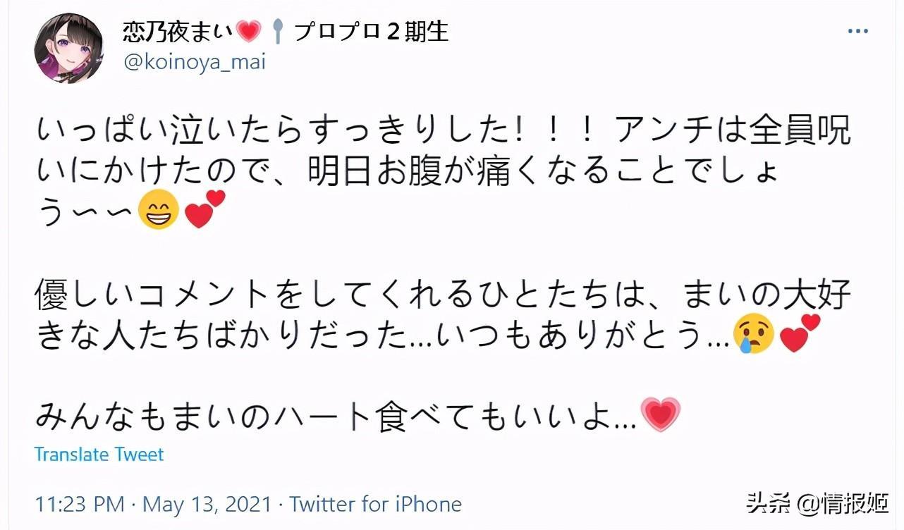 这个世界本没有那么多的壁障和冲突,大家看Vtuber无非也就图一乐,恋乃夜舞来B站了,那就欢迎,也不是要告别Youtube,只是拓宽自己的业务渠道而已。非要在推特下面骂,把别人Vtuber骂哭了才舒服,这就真的没意思了。