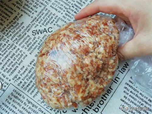 第四步:把冷藏好的肉泥从冰箱取出来,然后装入保鲜袋中,把保鲜袋中的空气挤压出来,然后收紧收口,提起保鲜袋,反复摔打猪肉泥,让肉馅变得紧实有弹性。(--记得多套一个保鲜袋,防止袋子破碎,肉泥漏出来。)