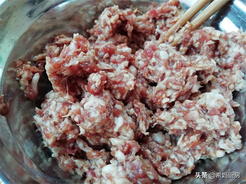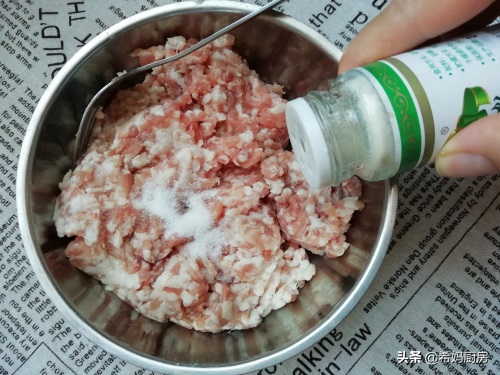 第三步:把猪肉泥装入一个大碗中,依次加入2克食盐、少量胡椒粉、1~2勺生抽、几滴老抽,然后用筷子顺着一个方向搅拌肉馅,让食材和调料混合均匀;