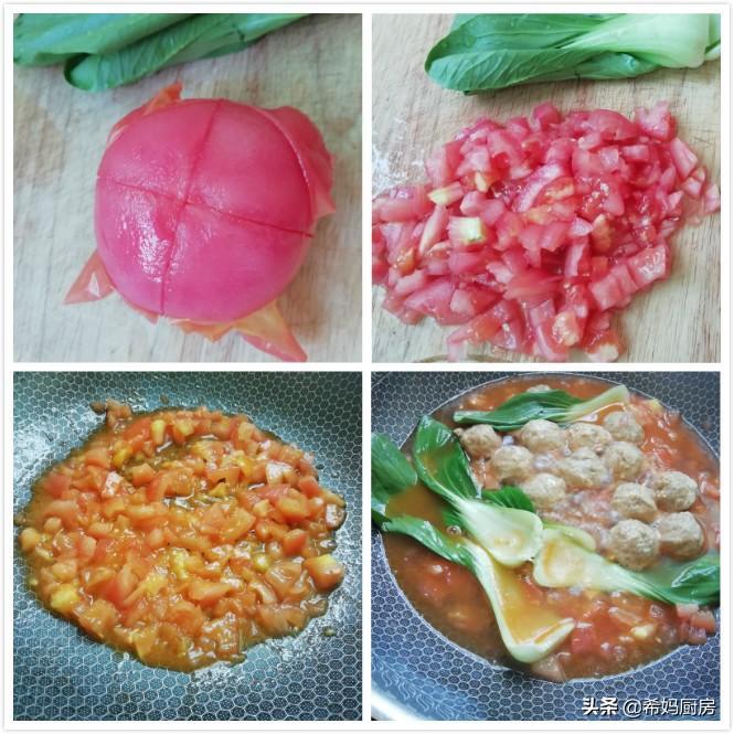 第二步:锅内热油,放入番茄丁炒几分钟,炒出红汁,然后倒入适量清水,烧开之后加入肉丸和青菜,煮一两分钟即可,然后放食盐调味。