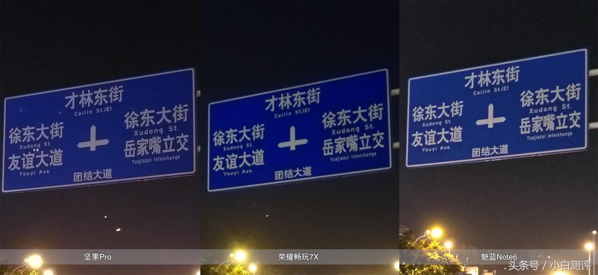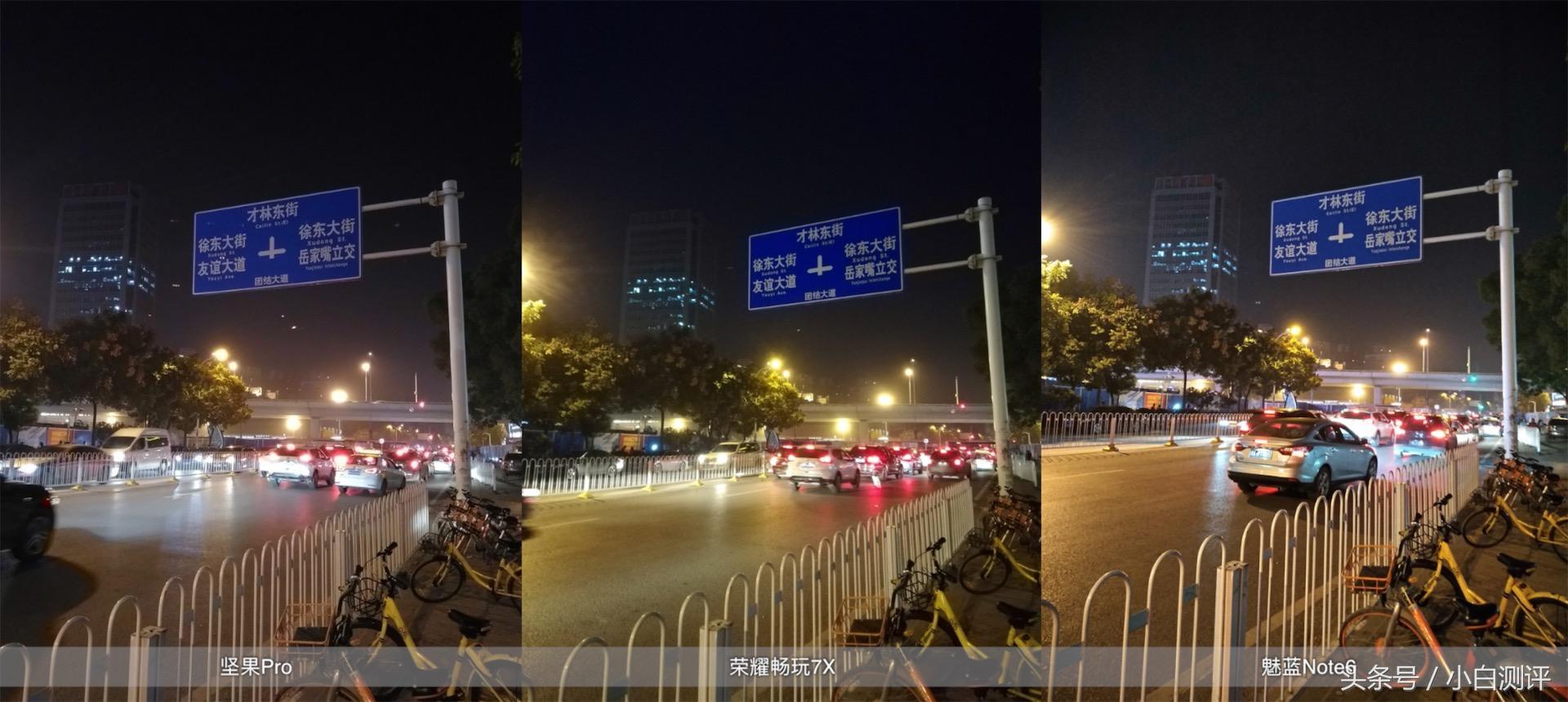 这一组夜景,三者的曝光都比较准确,但是能看出色温有些不一样,畅玩7X和魅蓝note6偏暖,坚果Pro偏冷。