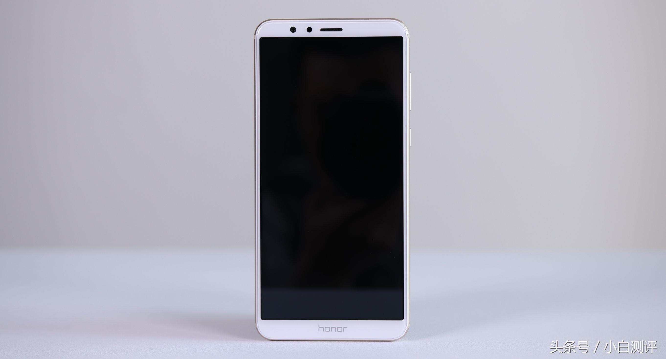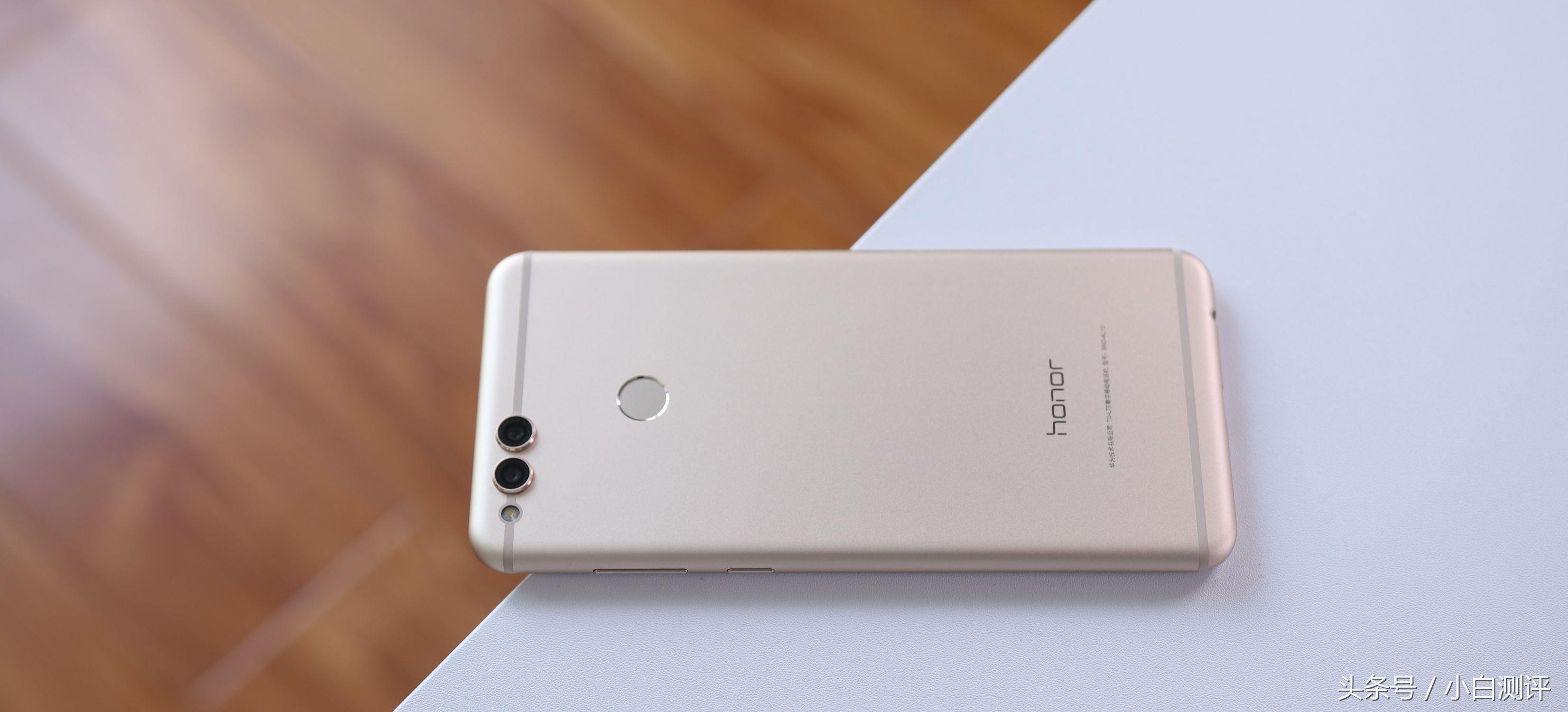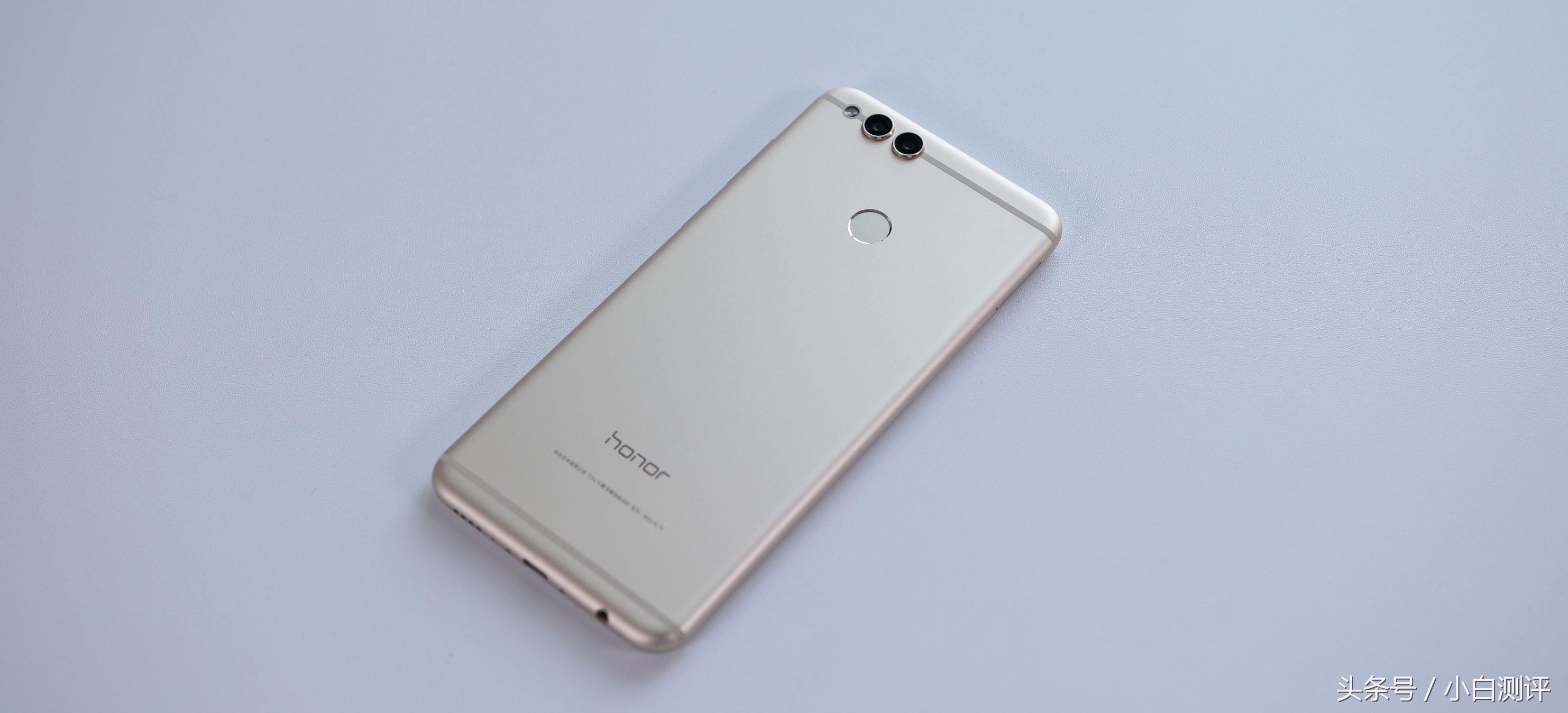 荣耀畅玩7X上采用了时下最流行的全面屏设计,上下额头相比于传统手机短了非常多,边框甚至比iPhone 8 Plus还要窄,机身上方是听筒、传感器、前置摄像头。机身底部是荣耀的logo,整机采用了全金属一体化设计,前面板是2.5D玻璃,背面也有荣耀的logo,背面最惹人注意的就是这两颗摄像头了,是分离的设计,看起来有一种天然萌,摄像头下方是指纹识别模块,我们这台是金色版 本,看起来还不错。