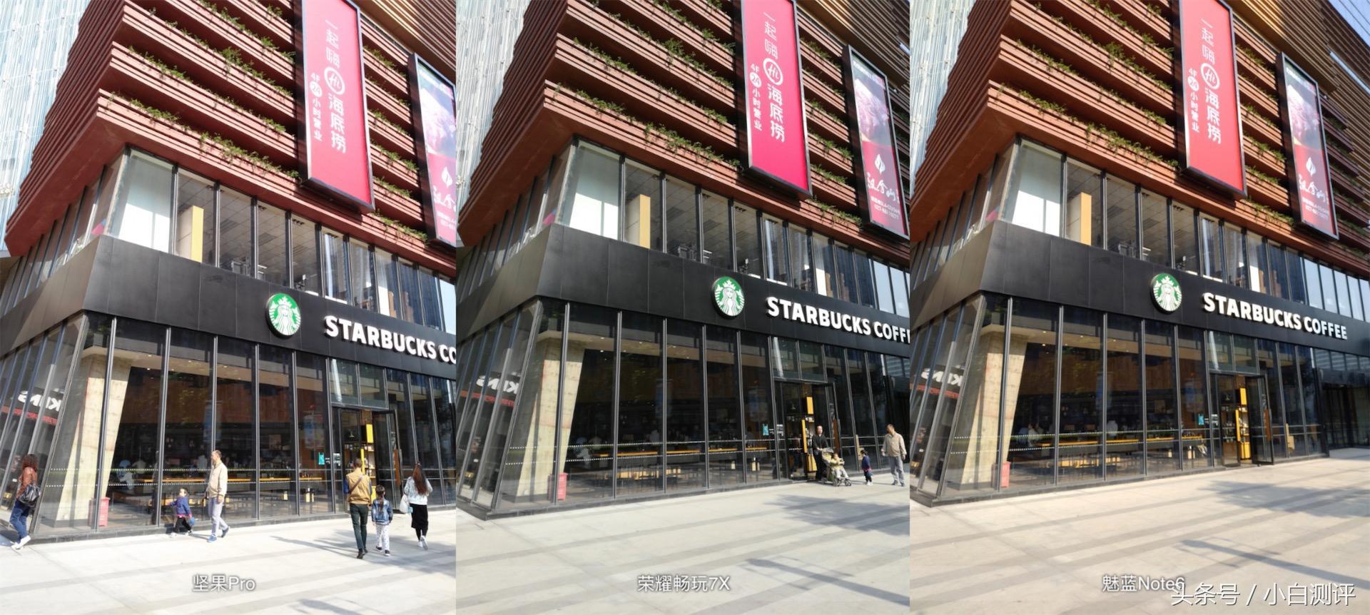 放大看一下细节星巴克的logo,三者的清晰度都不错,非要较真的话,还是畅玩7X的解析力最强最清晰。而且噪点控制的也好,对比度也清晰。