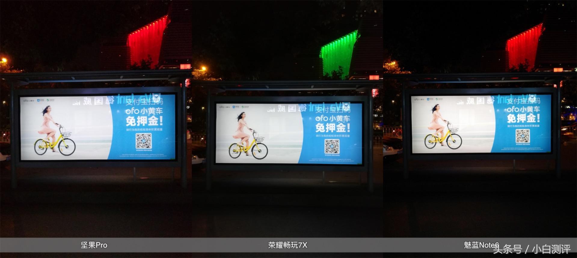 这一组夜景样张,三者的曝光都是以灯箱广告牌为基准了,亮度也基本相同,色彩也没有什么区别,但是能看出来坚果Pro与魅蓝note6出现了噪点和涂抹。畅玩7X的画面最纯净同时也最清晰。