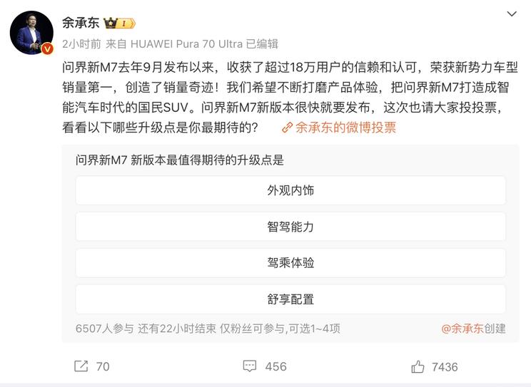 日前,华为常务董事、终端 BG 董事长、智能汽车解决方案 BU 董事长余承东在社交媒体上表示,问界 M7 新版本很快就要发布,这次也请大家投投票,看看以下哪些升级点是你最期待的?此前曾有消息称新车将会在 5 月末上市,根据投票选项来判断,新车的变化将包含外观内饰、智驾、驾乘以及舒享配置全方位升级。