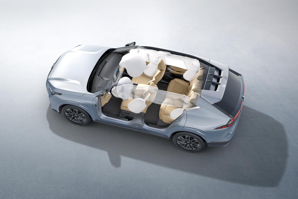 比如,乘员舱核心骨架 100% 采用超高强度钢,同级唯一的环抱式 8 气囊,覆盖全车 10 个位置,无论是前排还是后排,正面还是侧面,用户都能得到最高的安全保障。
