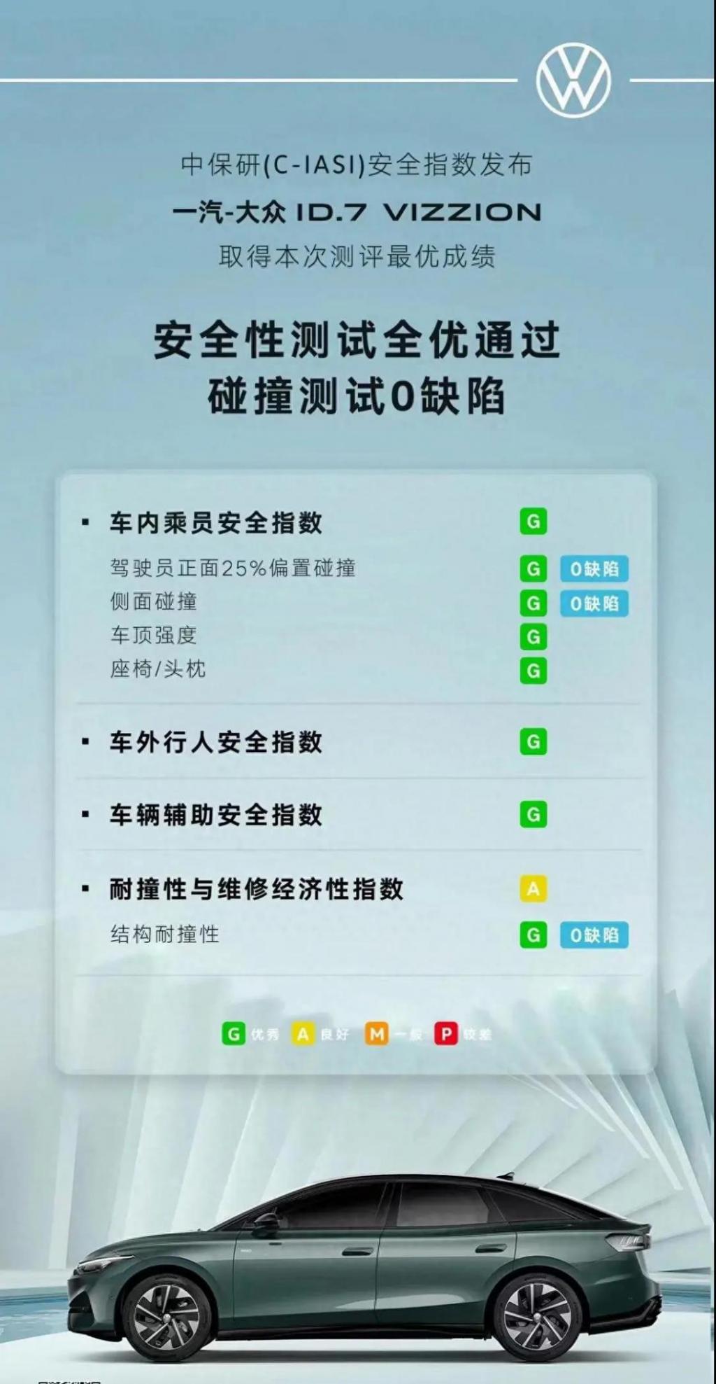 近日,中保研汽车安全指数成绩公布,一汽 - 大众 ID.7 VIZZION 获本次测评最优成绩,安全性测试全优通过,碰撞测试 0 缺陷。值得一提的是,ID.7 VIZZION 在车内成员安全指数、车外行人安全指数、车辆辅助安全指数及结构耐撞性方面,均获得 G 级(优秀)和 0 缺陷成绩。
