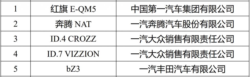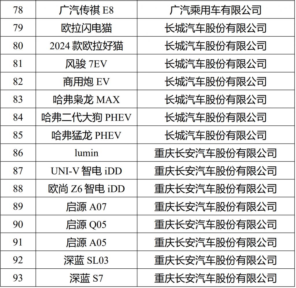 其它汽车集团方面,包括广汽集团旗下埃安 AION V、AION S,一汽集团旗下红旗 E-QM5、奔腾 NAT、大众 ID.4 CROZZ、丰田 bZ3,东风汽车旗下风神 E70、启辰大 V DD-i、纳米 BOX、本田 e:NS1,长安汽车旗下 Lumin、启源 A07、深蓝 SL03、欧尚 Z6 智电 iDD、UNI-V 智电 iDD,长城汽车旗下欧拉闪电猫、2024 款欧拉好猫、哈弗枭龙 MAX、哈弗二代大狗 PHEV 等车型均入选。