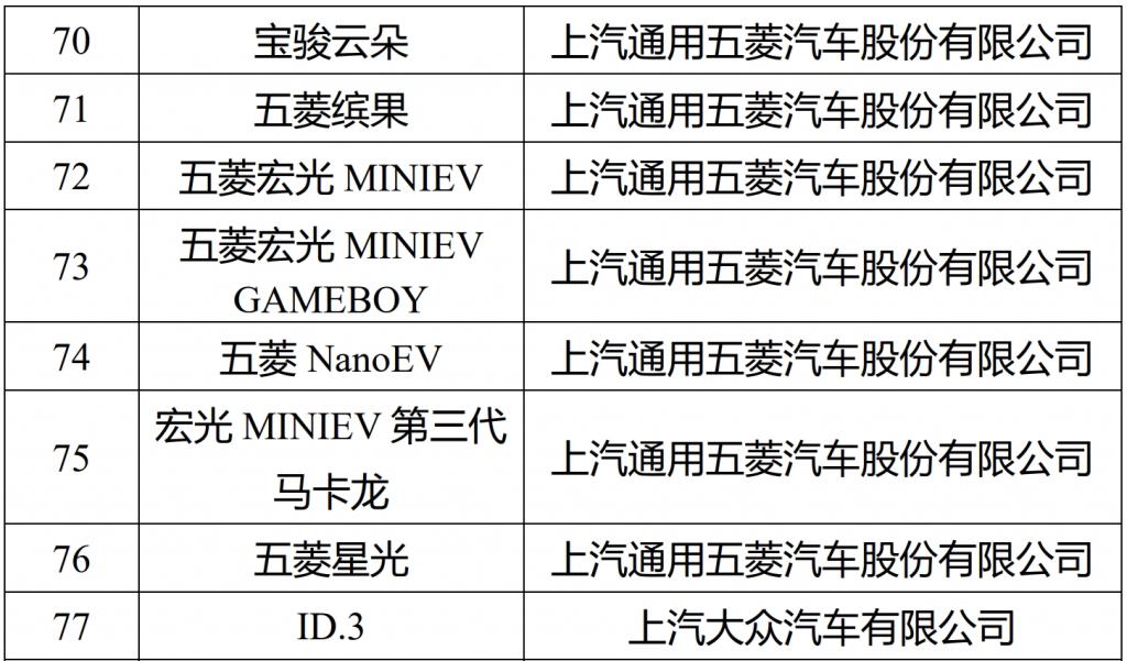 作为国内最大的汽车集团,上汽集团旗下自主品牌包括荣威 D7 DMH、荣威 eRX5、荣威 i6 MAX EV、荣威 CLEVER、名爵 MG4 EV 入选,以微型车为主力阵容的上汽通用五菱入选了 9 款车型,分别是宝骏 KiWi EV、宝骏悦也、宝骏云朵、五菱缤果、五菱宏光 MINIEV、五菱宏光 MINIEV GAMEBOY、五菱 NanoEV、宏光 MINIEV 第三代马卡龙和五菱星光。此外,上汽大众的 ID.3、上汽通用的别克 E5/ 别克微蓝 6 也出现在其中。