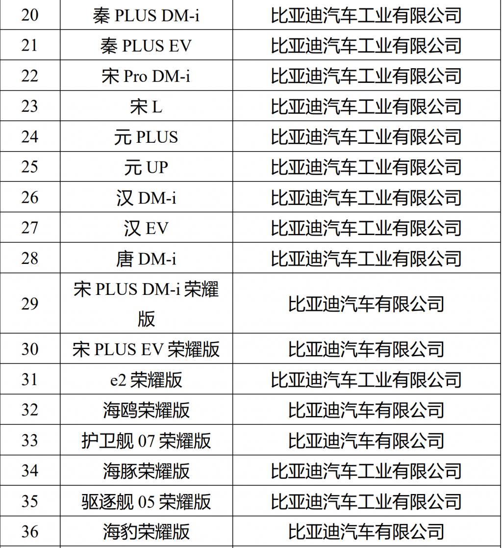 具体来看,比亚迪旗下包括秦 PLUS DM-i、秦 PLUS EV、宋 Pro DM-i、宋 L、元 PLUS、元 UP、汉 DM-i、汉 EV、唐 DM-i、宋 PLUS DM-i 荣耀版、宋 PLUS EV 荣耀版、e2 荣耀版、海鸥荣耀版、护卫舰 07 荣耀版、海豚荣耀版、驱逐舰 05 荣耀版、海豹荣耀版共计 17 款车型入选,几乎涵盖了比亚迪在售的所有车型,其中其驱逐舰 05 和秦 PLUS 售价为 7.98 万元起。
