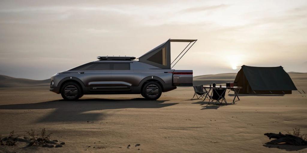 在外观功能方面,E-TRUCK 拥有双形态尾舱(载物 / 帐篷)、多功能前舱、双侧方舱、顶部集能板、功能化内饰部件、全维度感知 HMI 系统等设计要素,打造一体多变的内外空间形态,满足载物、越野、拖拽等不同的行驶状况,适应露营、聚会、探索等不同应用场景。