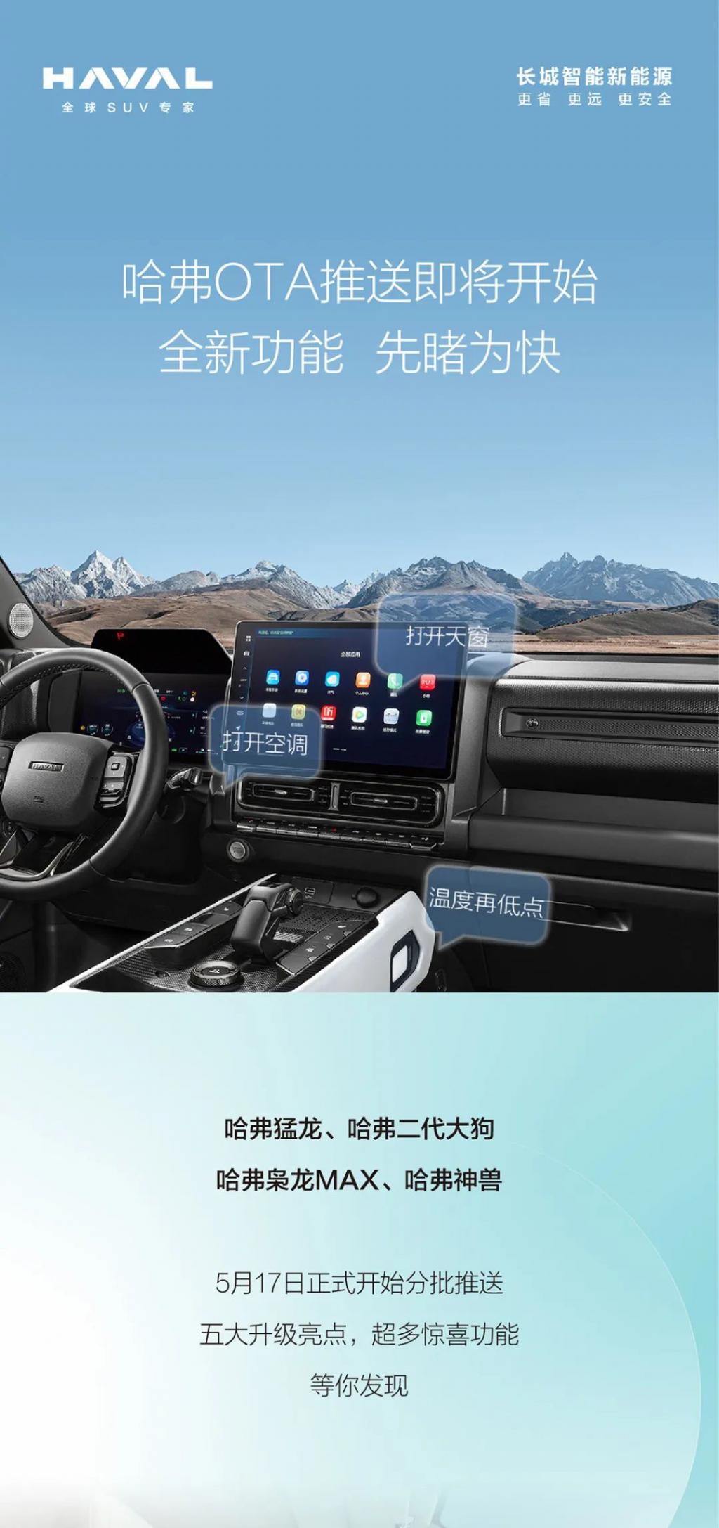 IT 之家 5 月 16 日消息,哈弗宣布旗下哈弗猛龙 、哈弗第二代大狗、哈弗枭龙 MAX 以及哈弗神兽将从 5 月 17 日开始陆续分批推送新版 OTA 升级。此外,哈弗 H6S、哈弗酷狗,近期也将进行 OTA 推送。