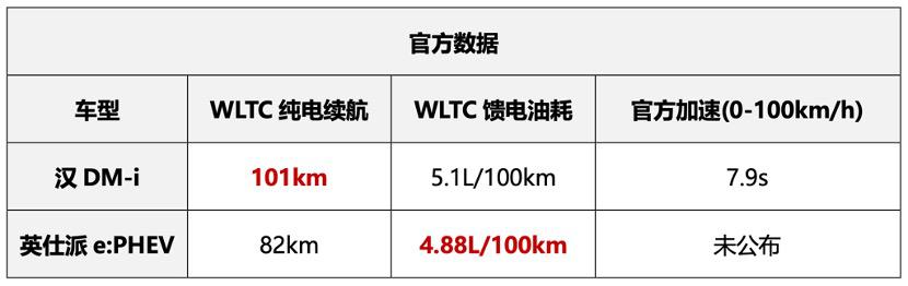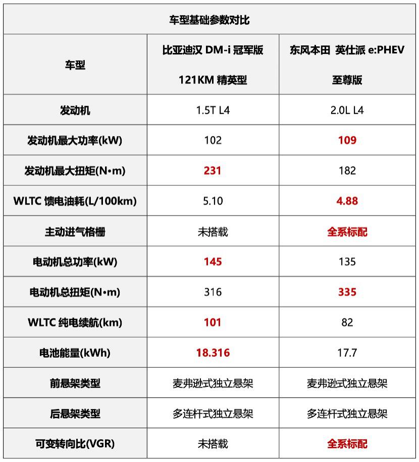 先来简单看看汉 DM-i 和英仕派 e:PHEV 的基础参数,我们选了两款车最热门的版本进行对比。
