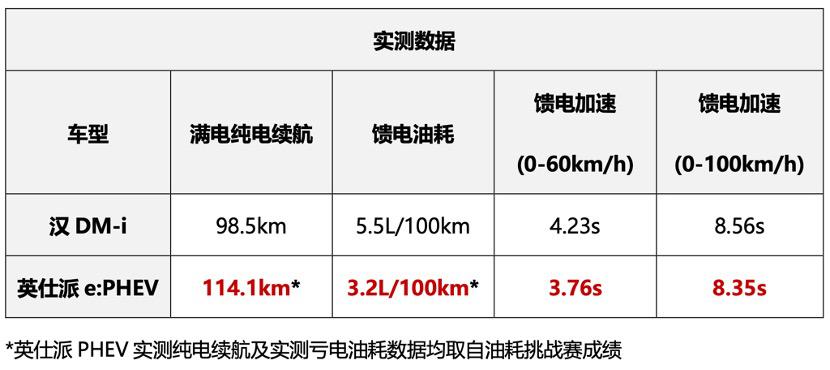 当然,口说无凭,我们还需要通过实地测试检验两台车的实力,经过汉 DM-i 和英仕派 e:PHEV 在满电、馈电两种状态下的实测成绩来看,我们发现英仕派 e:PHEV 竟然是严重 " 反向虚标 " 的那款车。