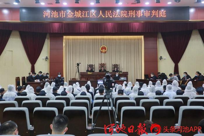 10月30日,金城江区人民法院依法对被告人韦道贵等42人涉嫌组织、领导黑社会性质组织等11项罪名一案作出一审宣判。该案组织、领导者韦道贵被依法判处有期徒刑25年,剥夺政治权利5年,并处没收个人全部财产;廖斌被判处有期徒刑17年6个月,剥夺政治权利4年,并处没收个人全部财产。其余40名被告人根据所犯罪行,分别被判处1年2个月至20年不等的有期徒刑,并处不同数额的财产。