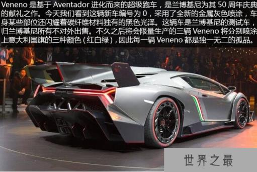 兰博基尼毒药这款兰博基尼超级跑车是为了纪念兰博基尼制造跑车50周年所制作的,原名:兰博基尼Veneno。Veneno在意大利西班牙语中有着是最强的,最积极的斗牛之一,也是西班牙语的 " 毒药 "的意思,在2013年的日内瓦车展上展出,该款车在全球范围内只生产了3辆,官方售价为300万欧元(折合人民币2500万),但如今是均已出售,据说其中一台就在中国!