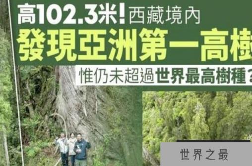 北京大学郭庆华和吕植所组成的课题小组与北京数字绿土科技公司,西子江生态保育中心以及山水自然保护中心在今年5月份组成了一支生物多样性的联合调查队,这支调查队深入雅鲁藏布大峡谷的国家级自然保护区进行考察,在林芝市波密县通县镇境内发现了这周亚洲第一高树,这棵树隐藏在众多的比较高的树木当中,从远处看并不十分出众,但是实际测量它的高度却达到了102.3米,将中国和亚洲树木最高的记录刷新。这颗西藏柏木是仅次于美国海岸红杉的世界第二高的树。美国海岸红杉的高度是116.07米。