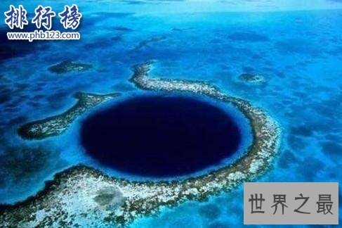 洪都拉斯蓝洞,为世界十大地质奇迹之一。又叫伯利兹大蓝洞,位于伯利兹境内。冰河时期是个干涸的大洞,冰川融化,海平面的升高让它变成了现在的样子。是灯塔礁的一部分,位于伯利兹城陆地大约100公里之遥,直径为0.4公里,洞深145米。由于深洞很深,因此呈现出深蓝色的景象,这一结构在世界上被称为“蓝洞”。